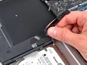 Перед установкой скобы AirPort/Bluetooth на верхнюю крышку убедитесь, что небольшой пластиковый выступ по её левому краю вошёл в специальное отверстие, вырезанное в чёрном пластиковом корпусе вокруг отверстия для оптического привода.
