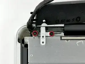 Удалите три винта Phillips 2,5 мм, фиксирующие оптический привод к верхней части корпуса.