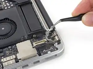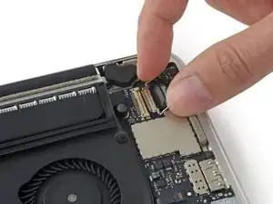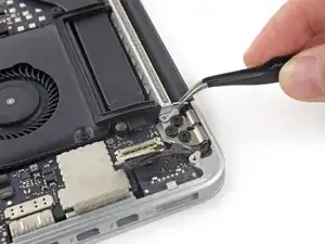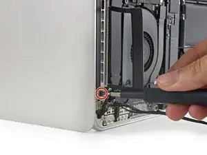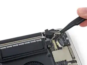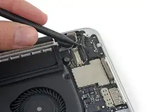 Кончиком лопатки откиньте фиксатор кабеля данных дисплея и поверните его в сторону порта питания MagSafe 2.