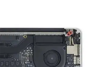 Снимите два винта T5 Torx длиной 3,2 мм, крепящие алюминиевые крышки шарниров к верхней части корпуса.