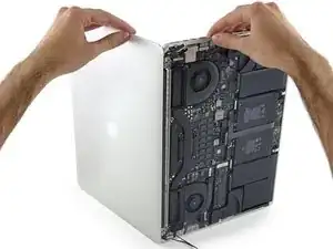 Снимите две алюминиевые заглушки шарниров с MacBook Pro.