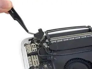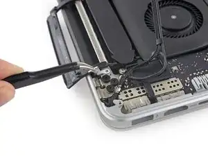 Используйте лопатку или пинцет, чтобы отсоединить три кабеля антенны AirPort, подняв их прямо вверх от разъёмов на плате AirPort, затем отогните их в сторону.