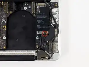 Удалите единственный винт Torx T5 длиной 2.7 мм, крепящий плату AirPort к плате ввода/вывода.