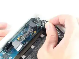 Отключите кабель светодиода в левом верхнем углу системной платы, потянув его прямо наружу от платы.