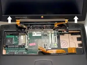 Отключите оранжевый кабель данных дисплея с левой стороны компьютера. Возьмитесь за кабель около разъёма и потяните строго вверх.