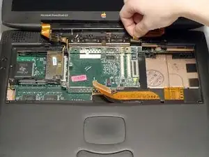 Отключите оранжевый кабель инвертора дисплея с правой стороны компьютера. Возьмитесь за кабель около разъёма и потяните строго вверх.