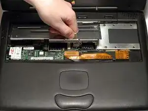 Отсоедините модем от системной платы, подняв его правую сторону с помощью лопатки, кончика пальца или плоского неметаллического инструмента.