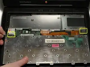 Отключите два разъёма клавиатуры, освободив защёлки, и потяните ленточные кабели строго вверх.
