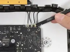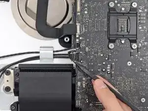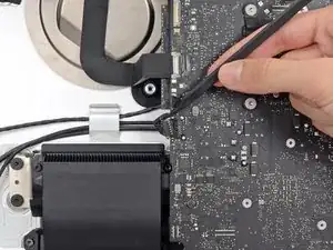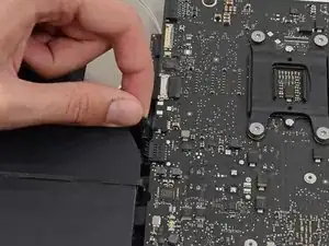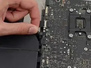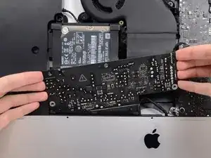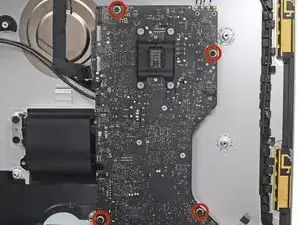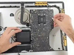 Поднимите материнскую плату прямо вверх и извлеките её из iMac.