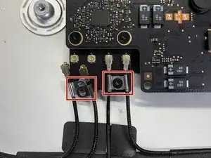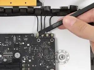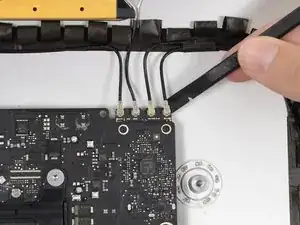 Используйте плоскую кромку лопатки, чтобы отключить каждый из четырёх разъёмов антенн от платы AirPort/Bluetooth.