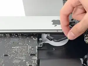 На этом этапе вдоль нижнего края дисплея всё ещё остаётся полоса клея, которая удерживает дисплей на раме, как шарнир. Ослабить этот клей можно, несколько раз слегка пошевелив дисплей вверх и вниз.