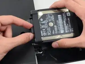 Выкрутите единственный винт Torx T10 длиной 7,2 мм, крепящий лоток жесткого диска к задней панели.