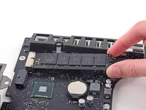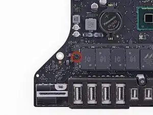 Снимите единственный винт Torx, фиксирующий SSD на материнской плате.