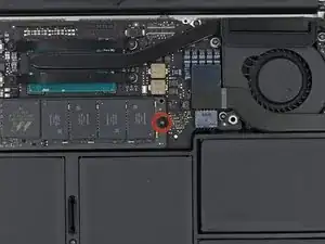 Удалите один винт Torx T5 размером 2.9 мм, фиксирующий SSD на материнской плате.