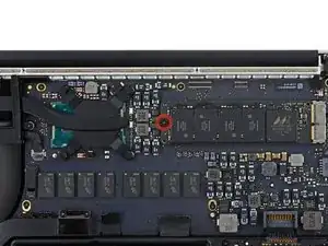 Удалите один винт T5 Torx длиной 2,9 мм, фиксирующий SSD к материнской плате.