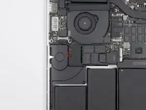 Удалите единственный винт T5 Torx длиной 3.1 мм, крепящий SSD к материнской плате.