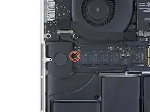 Выверните один винт T5 Torx длиной 2,9 мм, фиксирующий SSD к плате.