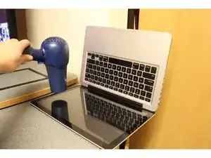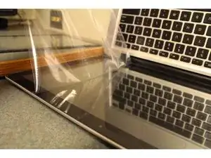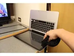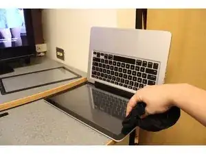 Подготовьте чистое рабочее место и соберите все принадлежности. Вам понадобятся MacBook Pro, новое стекло, фен, салфетка для очистки экрана и присоска.