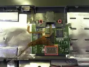 С помощью отвертки Torx №9 удалите два винта длиной 0,20 дюйма, обведённые красным, которые держат тачпад на месте. Это отсоединит кнопку мыши.