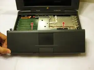 Под панелью находится ещё один шлейф, соединяющий тачпад; при подъёме передней панели будьте осторожны.