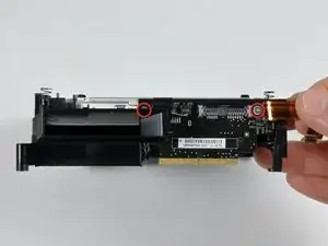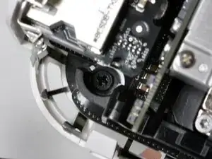 Снимите два серебристых винта Phillips, удерживающие SuperDrive у разъёма межплатного кабеля.