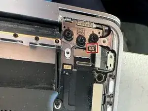 Используйте отвертку Torx T3, чтобы выкрутить два винта 2.4 мм, фиксирующие кронштейн кабеля дисплея.