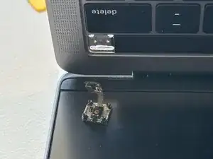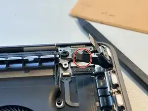 Используйте лопатку, чтобы отключить ленточный кабель трекпада, аккуратно поддев разъём прямо вверх от материнской платы.