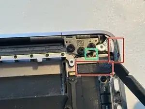 Зелёным обозначен один заметный винт, который нужно удалить, поскольку плата, которую он фиксирует, препятствует выводу/вставке разъёмов Touch Bar через основной корпус MacBook.