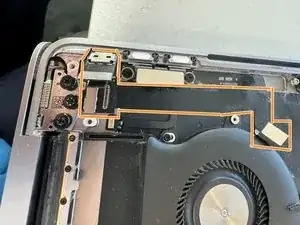 Красным отмечены два разъёма для Touch Bar. Нам нужно будет сначала снять другие детали, чтобы освободить их и установить новые разъёмы.