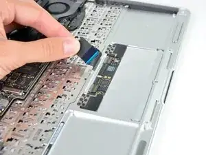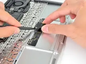 Одной рукой приподнимите ленточный кабель клавиатуры и сдвиньте его немного в сторону от трекпада, чтобы получить доступ к находящемуся под ним ZIF‑разъёму.