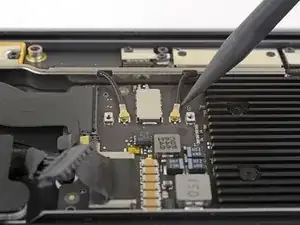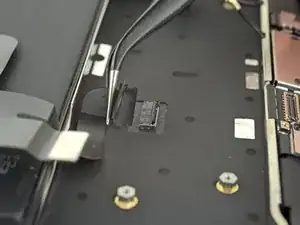 Используйте Torx T3, чтобы удалить два винта 1,4 мм, фиксирующие скобу разъёма трекпада.