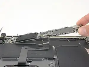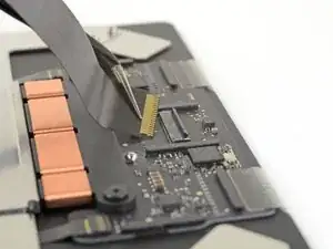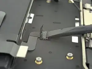 Используйте плоский конец лопатки, чтобы приподнять небольшую фиксирующую защёлку на ZIF-разъёме тачпада.