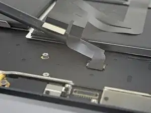 Осторожно подденьте монтажной лопаткой кабель тачпада в направлении разъёма на клавиатуре, чтобы отделить клей, крепящий его к верхней части корпуса.