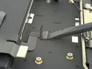 Используйте Torx T3, чтобы удалить два винта 1,5 мм, фиксирующие скобу разъёма кабеля дисплея.