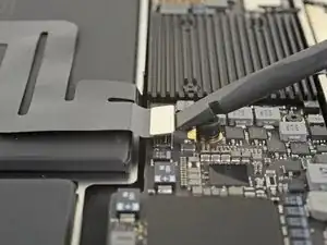 Используйте Torx T3, чтобы удалить два винта 1,3 мм, фиксирующие скобу разъёма USB-C.