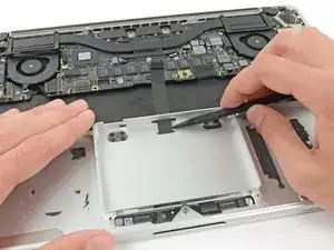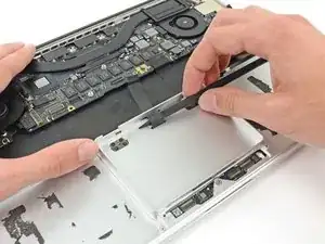 Вставьте наконечник лопатки между ленточным кабелем трекпада и верхней частью корпуса внутри отсека SSD, чтобы удалить оставшийся клей.