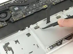 Используйте пинцет, чтобы снять два крепёжных кронштейна трекпада с верхней части корпуса.