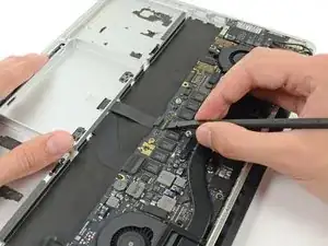 Поднимите и удалите кабель платы ввода-вывода из MacBook Pro.