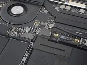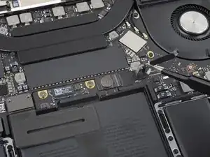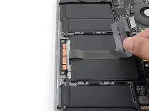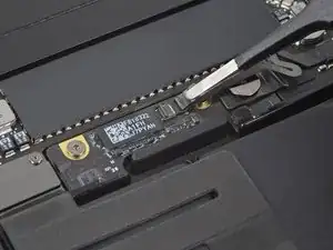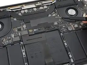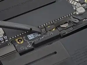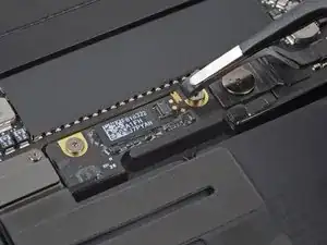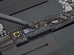 Используйте лопатку, чтобы отсоединить ленточный кабель трекпада, аккуратно поддев его разъём и подтягивая прямо вверх от платы логики.
