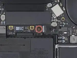 С помощью отвёртки T5 Torx выкрутите панкейк-винт 3,7 мм, удерживающий разъём подачи питания аккумулятора.