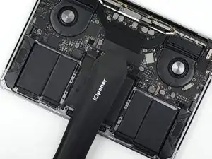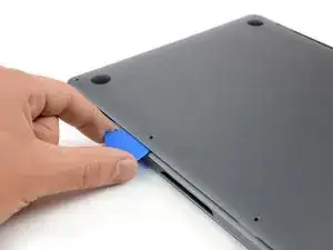 Приложите присоску к нижней крышке в передней центральной части MacBook Pro.