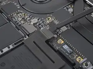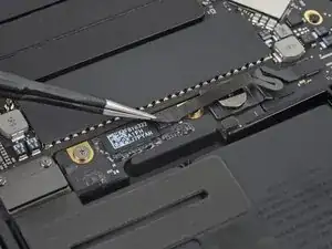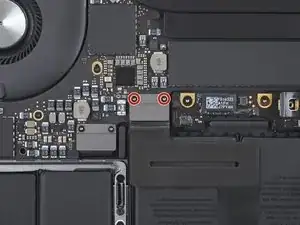 Используйте отвертку T3 Torx, чтобы вынуть два винта 1.8 мм, фиксирующие скобу разъёма кабеля трекпада.