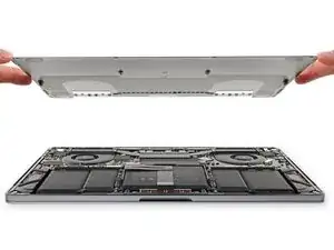 Резко потяните нижнюю крышку к передней части MacBook (от петли) чтобы отделить последние защёлки, удерживающие крышку.