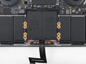 Приготовьте iOpener и положите его на ленточный кабель трекпада примерно на минуту, чтобы размягчить клей, фиксирующий кабель к верхней части батареи.