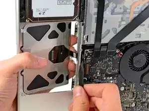 При необходимости аккуратно выведите край трекпада, ближайший к клавиатуре, из его выемки в верхней крышке, отталкивая его от кронштейнов, прикреплённых к верхней крышке.
