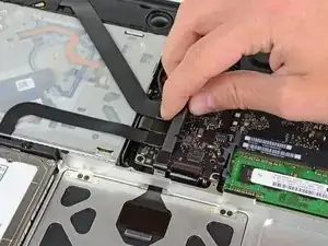 Возможно, потребуется использовать лопатку, чтобы помочь провести разъём трекпада мимо края логической платы.