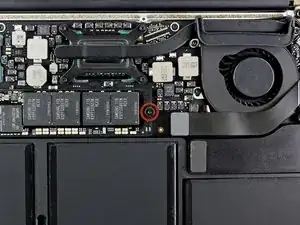 Удалите один винт T5 Torx длиной 2.9 мм, который удерживает SSD на материнской плате.
