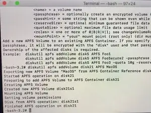 Из предыдущего шага запомните идентификатор нового тома (обведён красной рамкой). Он будет указан в строке: «Formatting identifier as Mac OS Extended (Journaled) with name MacOS».