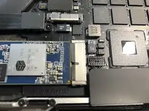 Для снятия винта, фиксирующего текущую карту SSD, требуется бита Torx T4. Подденьте SSD только настолько, чтобы извлечь его. Установить новый накопитель будет сложнее, чем снять старый. Не беспокойтесь — это подходящая деталь. Убедитесь, что новый SSD полностью установлен в разъём. Если этого не сделать, диск не будет обнаружен на следующем шаге. См. изображение.