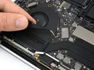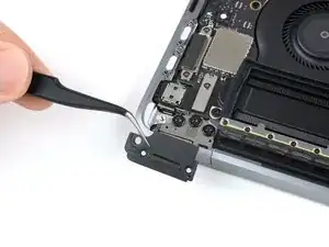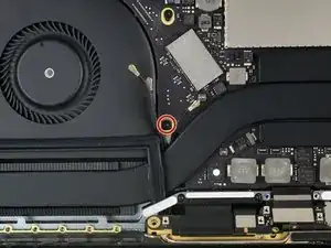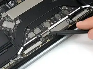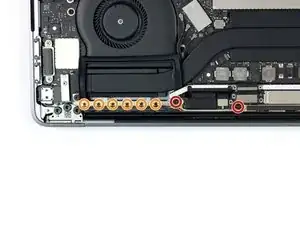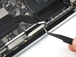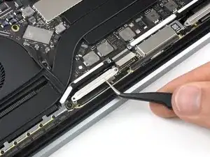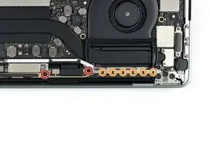 Снимите два винта T3 Torx длиной 1,7 мм, крепящие алюминиевую крышку сверху гибкого разъёма кабеля дисплея.